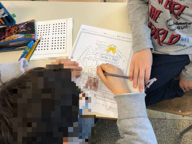 Completamento di disegni natalizi abbinando colori ai risultati di calcolo di addizione e sottrazione